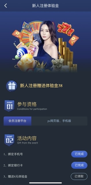 注册下载APP绑定手机号银行卡活动自助领取,活动里的充值不用管,彩金限制平台自行查看